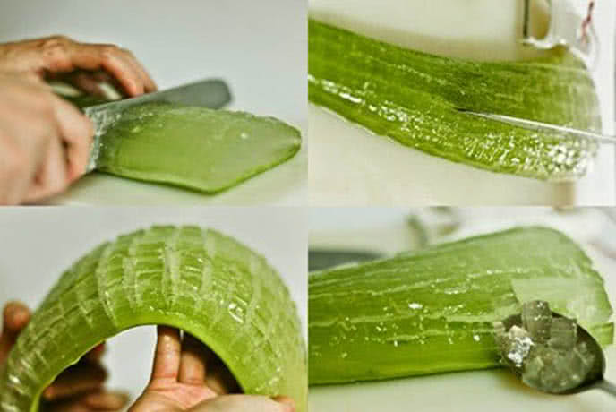 Dùng dao bóc tách lớp vỏ ngoài lô hội, rồi dùng thìa nạo lớp gel lô hội bên trong.